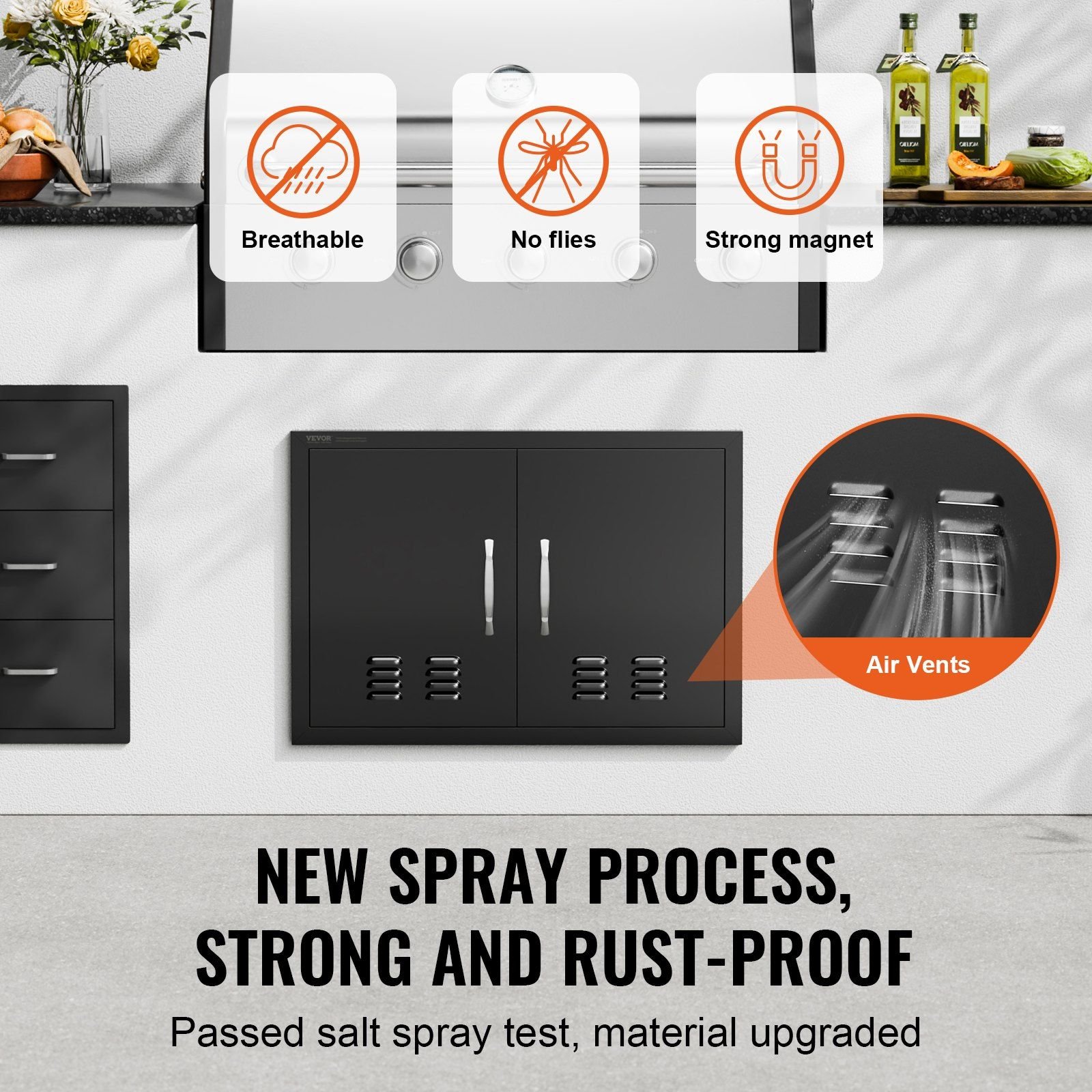 2.New Spray Process: Utilizing a new powder-coated matte black process, rust-proof and waterproof, easy to clean, the exquisite black color makes your outdoor cooking area more unique and elegant. The integrated thickened frame structure is durable, with a fully seamless design, no sharp corners. The unique U-shaped panel provides better strength and durability. Magnets at the top and bottom keep the cabinet tightly closed.