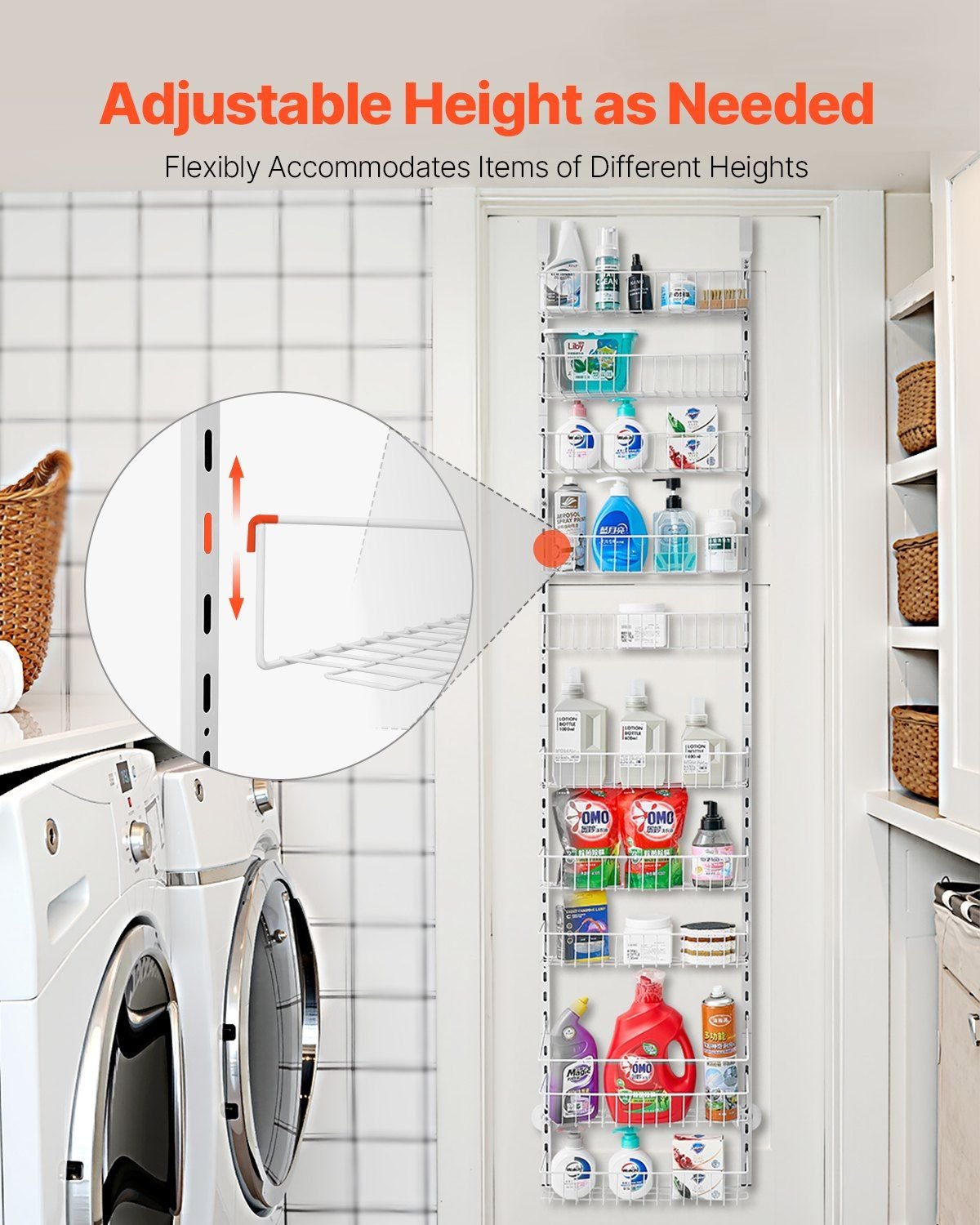 5.Multifunctional Storage: This adjustable cabinet door organizer is perfect for apartments and renters! Whether you need extra storage in the kitchen, pantry, bathroom, living room, or laundry room, it's the ideal solution to meet your needs